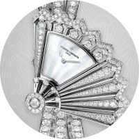 This 18K white gold watch is set with 81 round-cut diamonds and equipped with a precise moon phase. The moon phase is more exquisitely inlaid with mother-of-pearl, and the starry sky background matches the color of the crocodile leather strap for a unique beauty. The complication is poetic and only ..